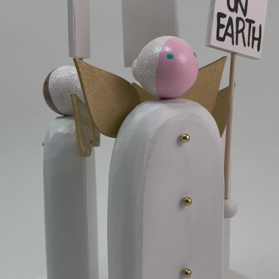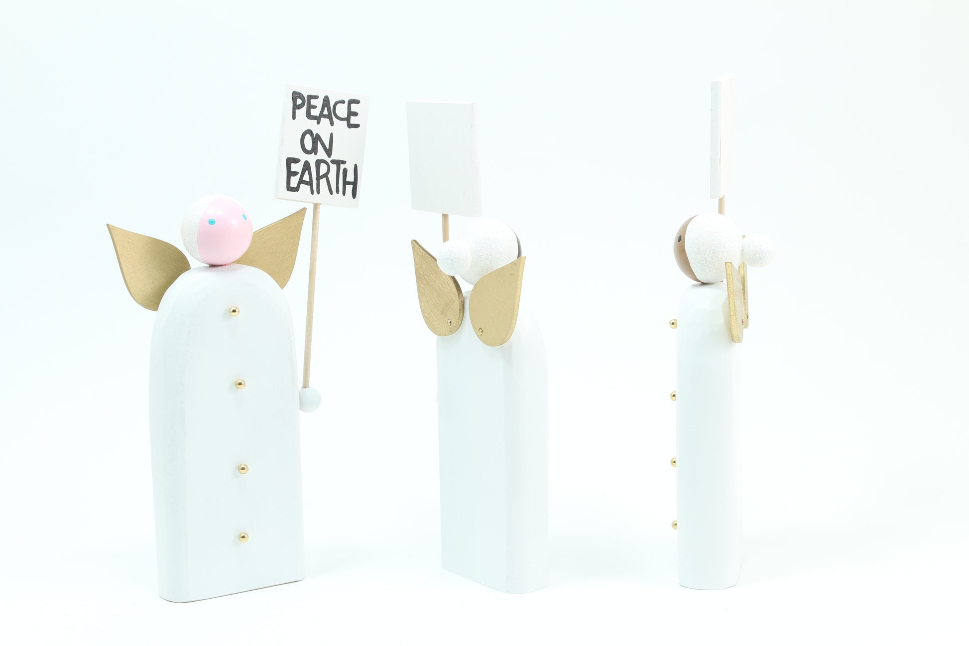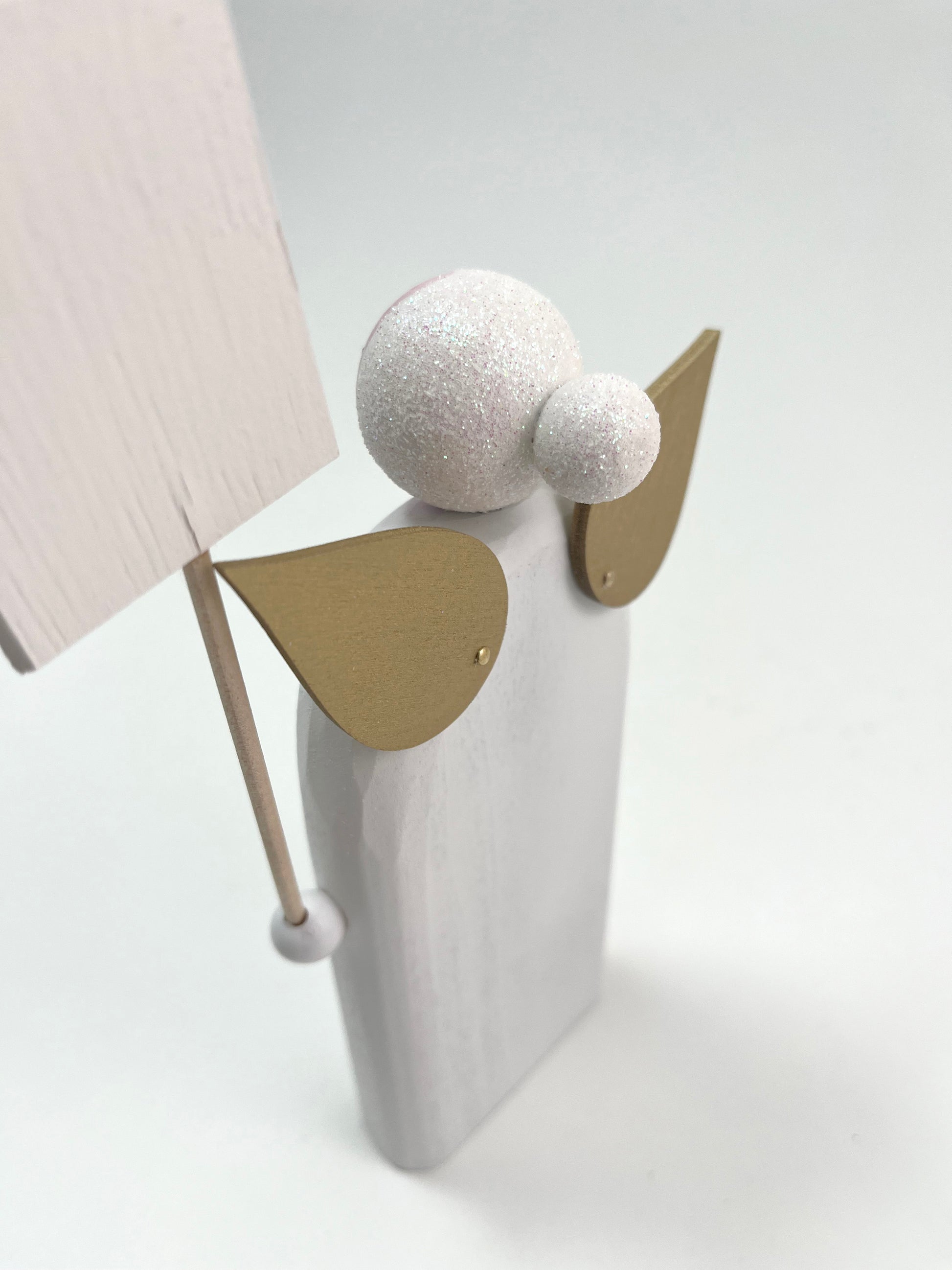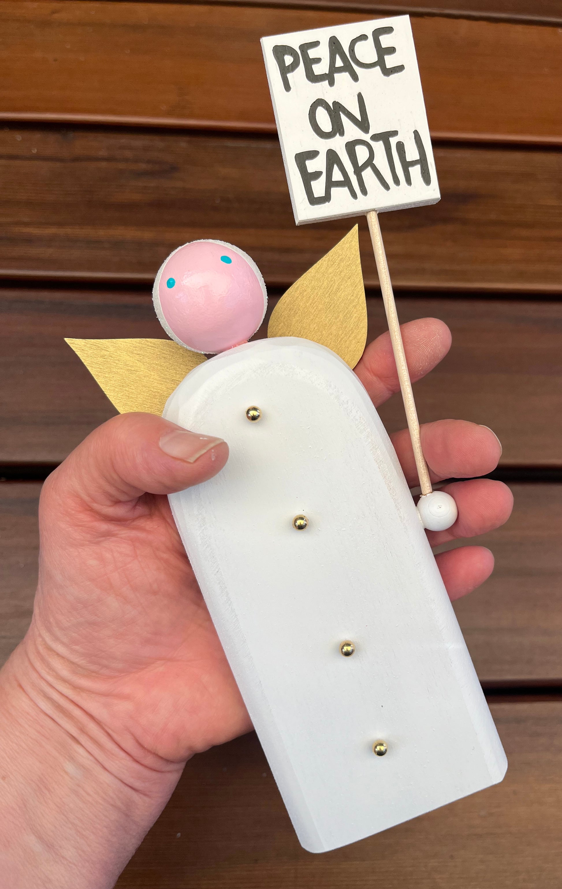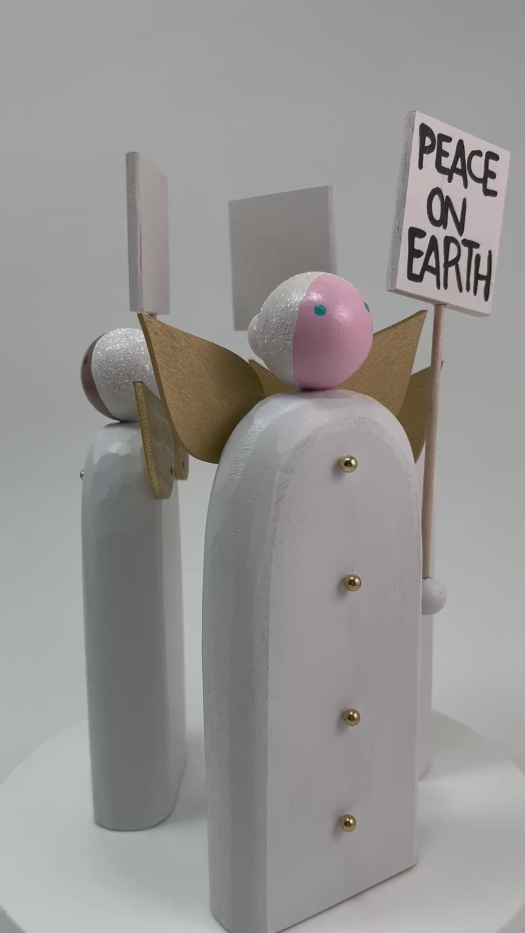 This angel figure will make your holiday guests smile. Made from wood with glittery hair and gold wings and buttons, she stands about 9" tall and pairs perfectly with my picketing Santas, Rabbis and elves to make a sweet holiday tableau!