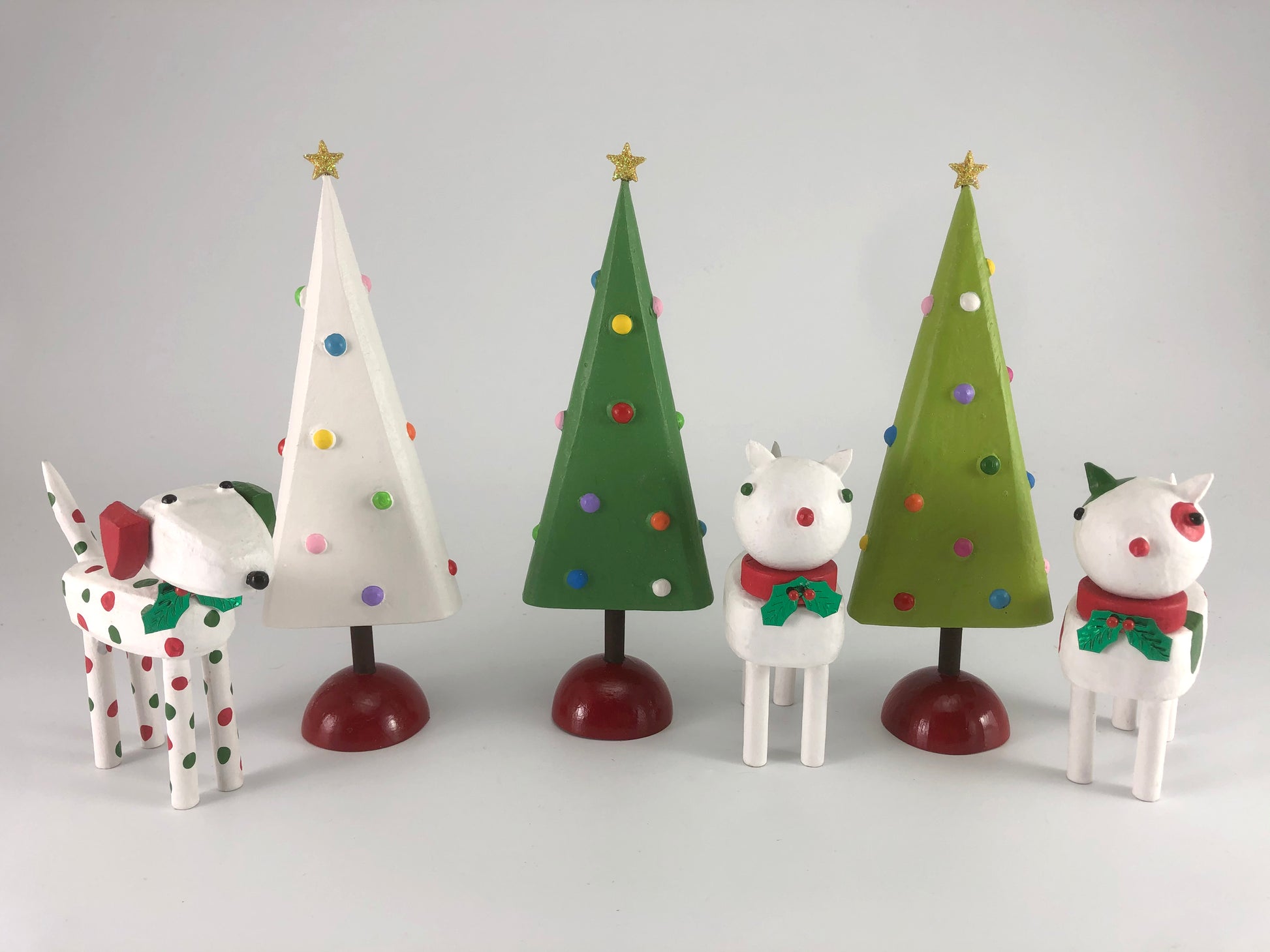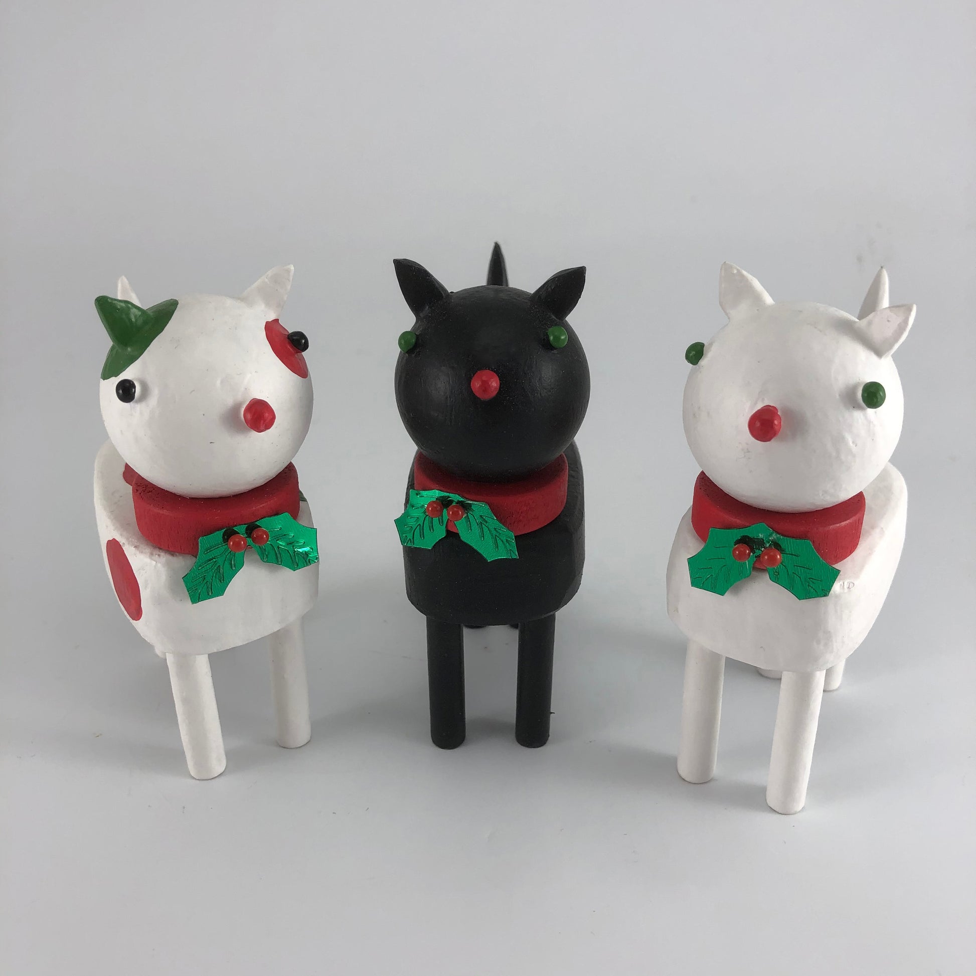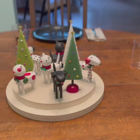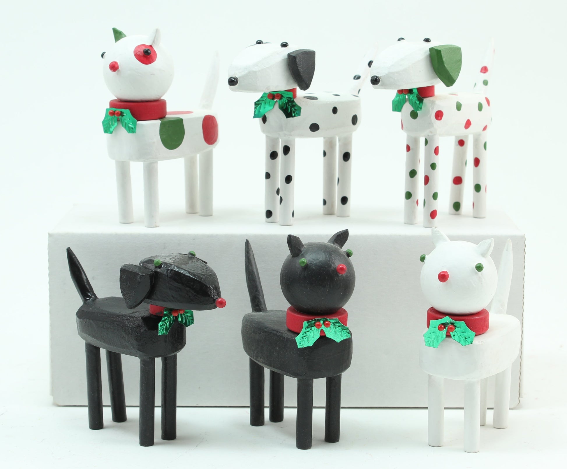 Create your own holiday centerpiece or tablescape with a miniature cat or dog figure made from reclaimed wood. These pieces have handpainted details and a red collar with a sprig of holly attached.