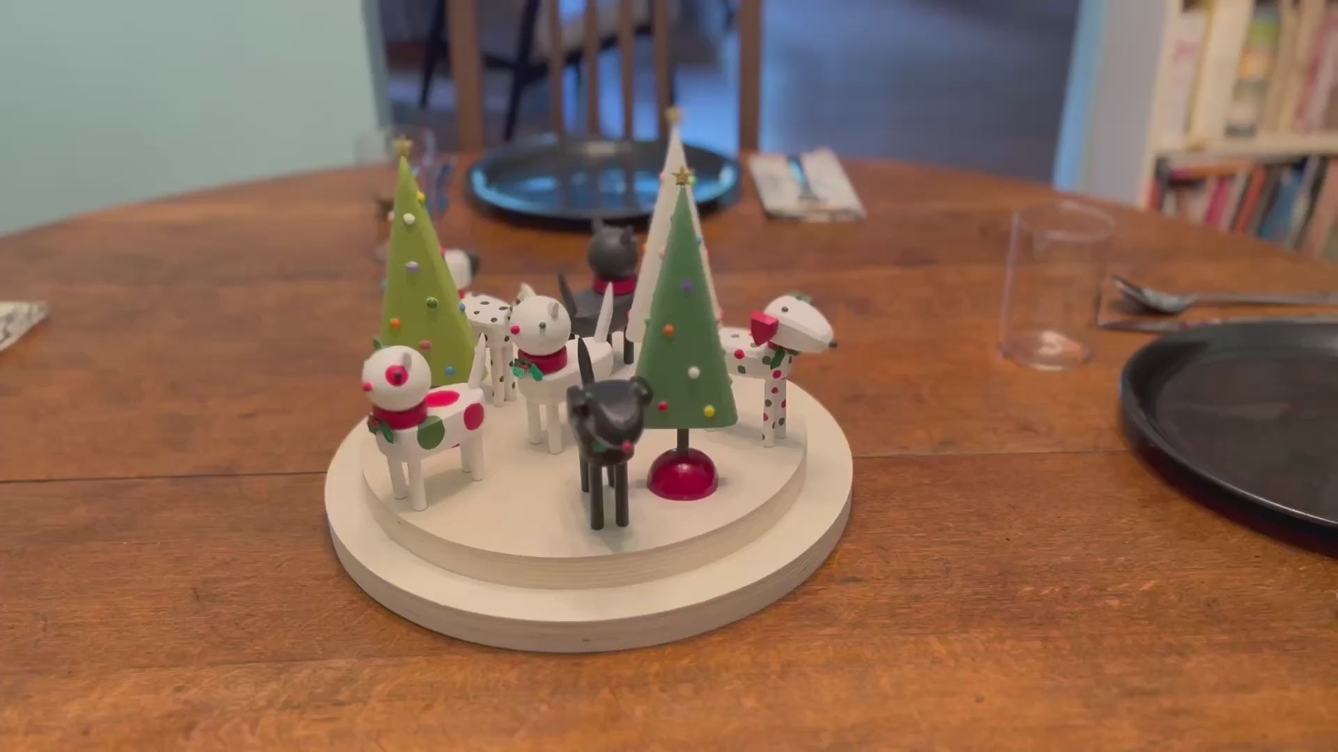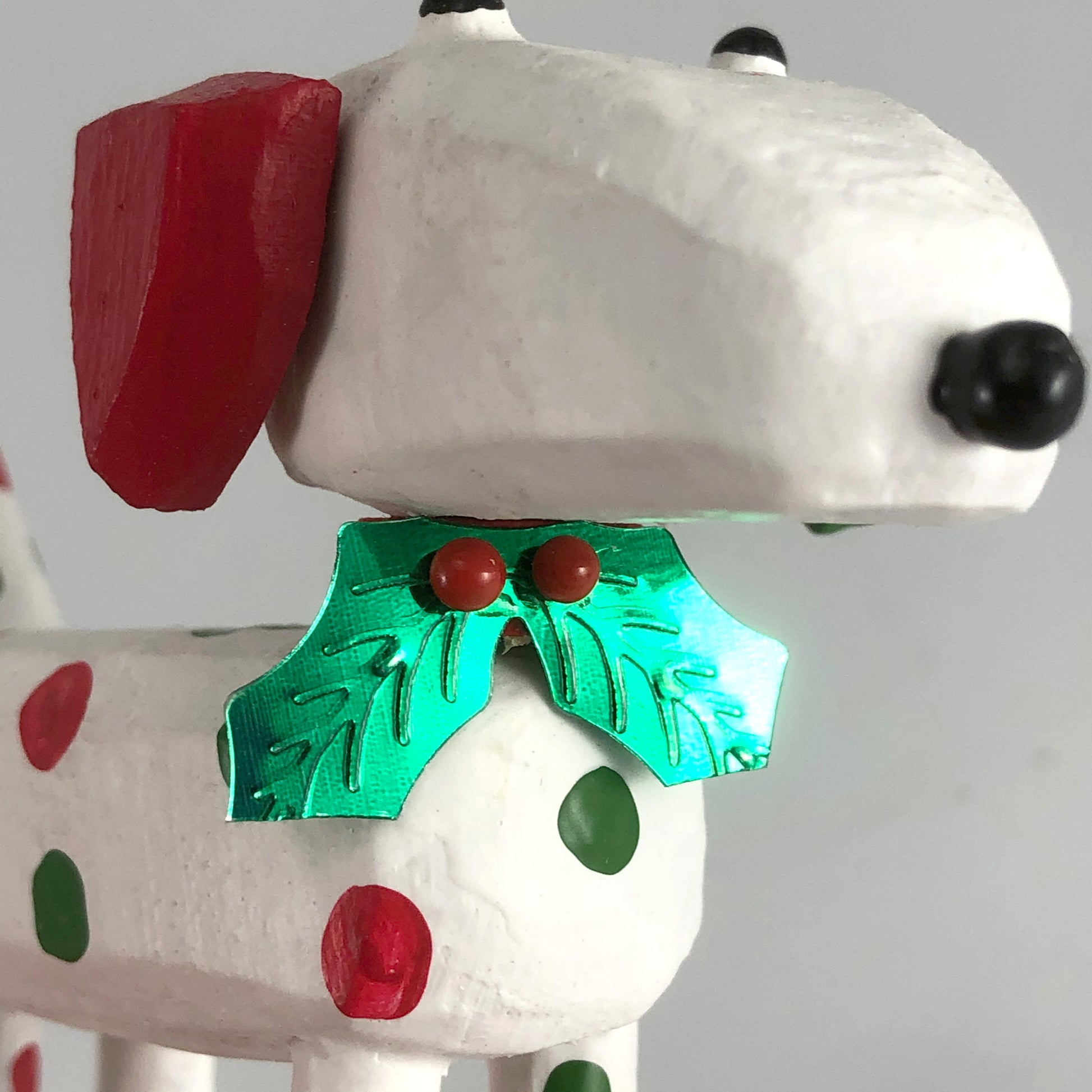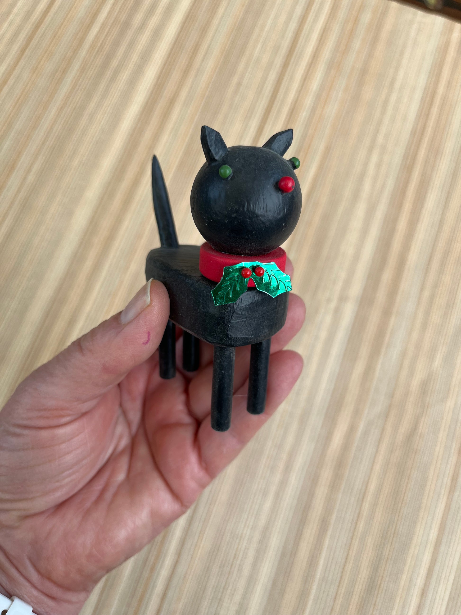 Create your own holiday centerpiece or tablescape with a miniature cat or dog figure made from reclaimed wood. These pieces have handpainted details and a red collar with a sprig of holly attached.