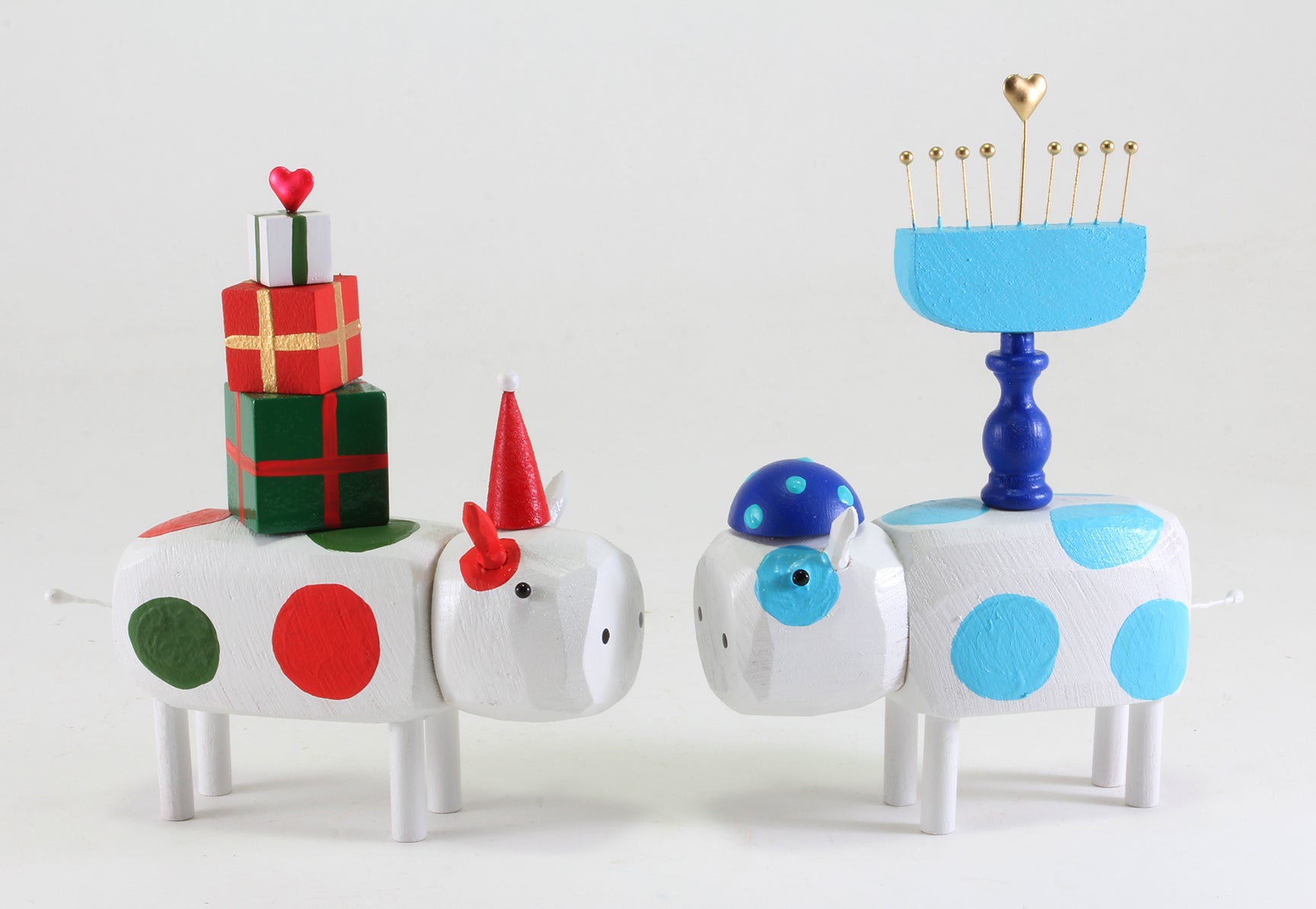 Christmas Cow is 5 inches high, and Hanukkah Cow is 5.5 inches high. Both are about 2 inches wide and 5 inches long.
