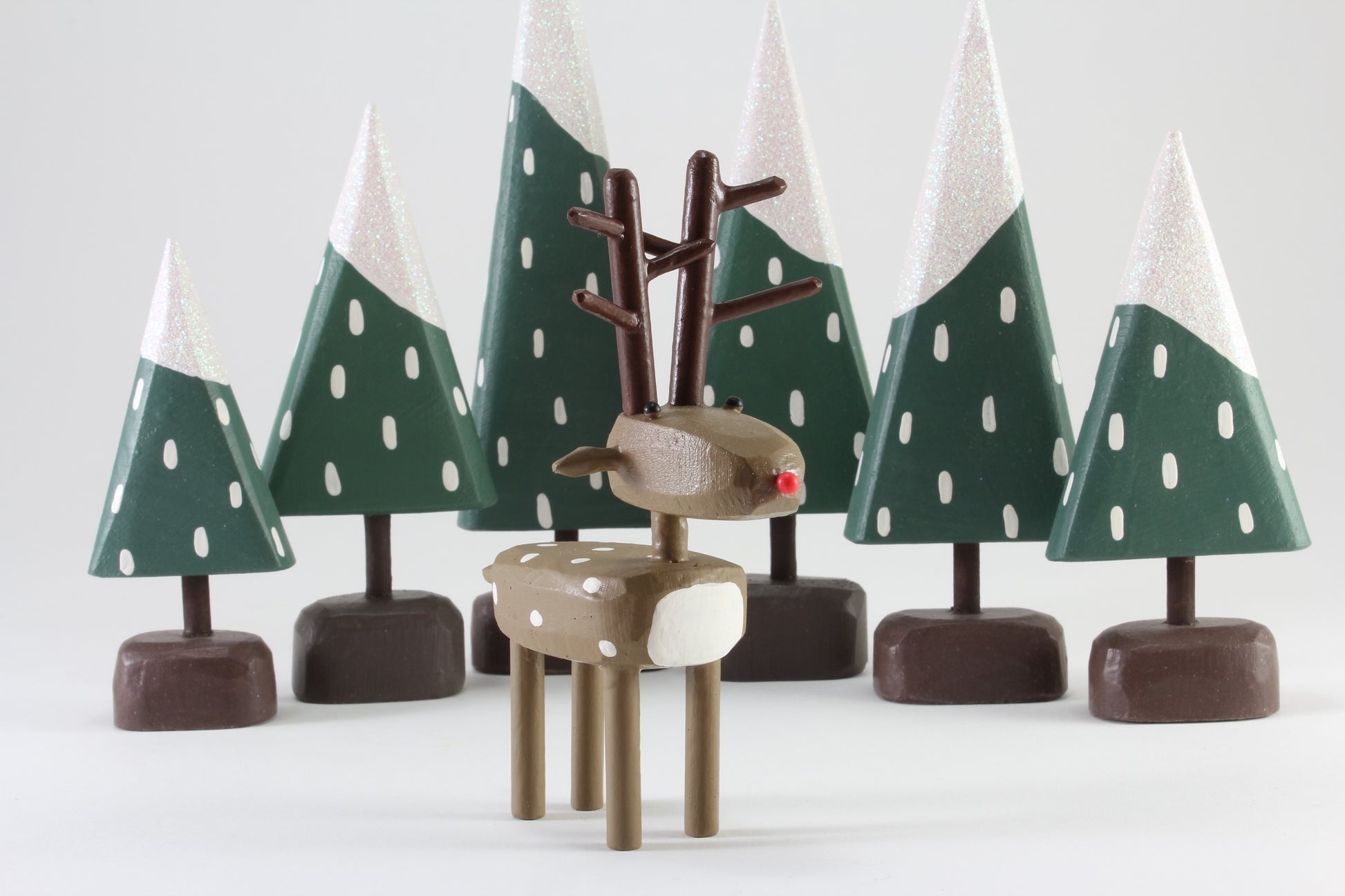Create your own forest scene, centerpiece or tablescape with this handmade reindeer figures made from reclaimed wood. Hand painted spots are on its back and it has a red nose.