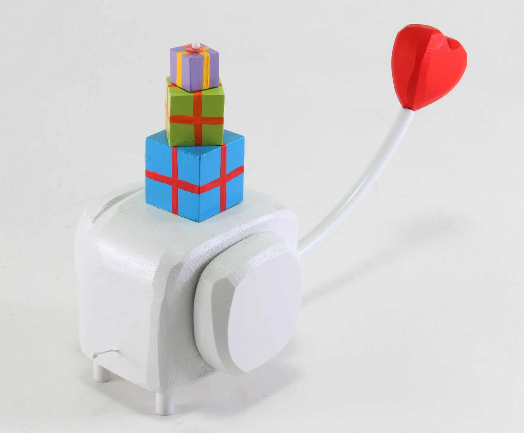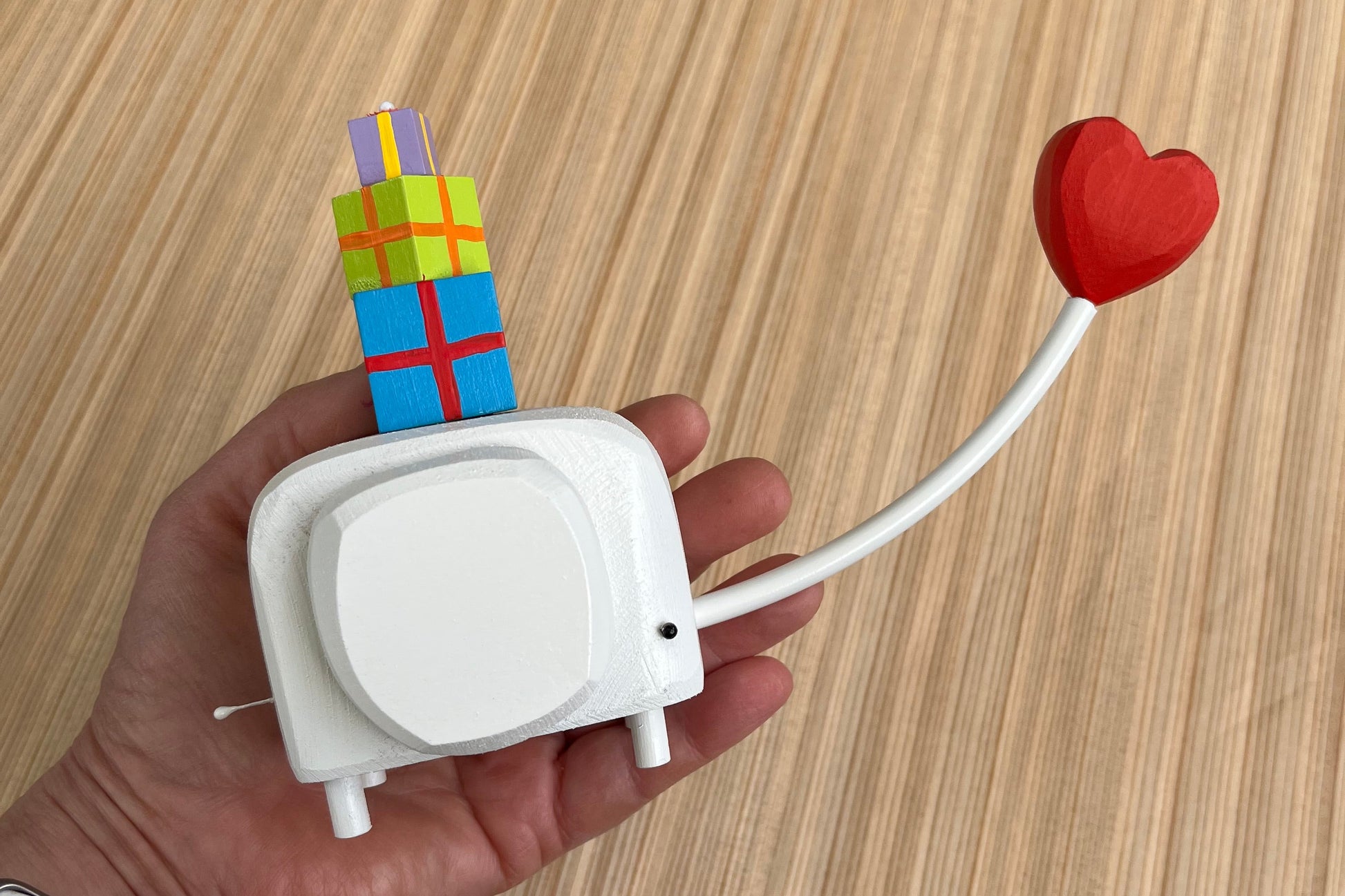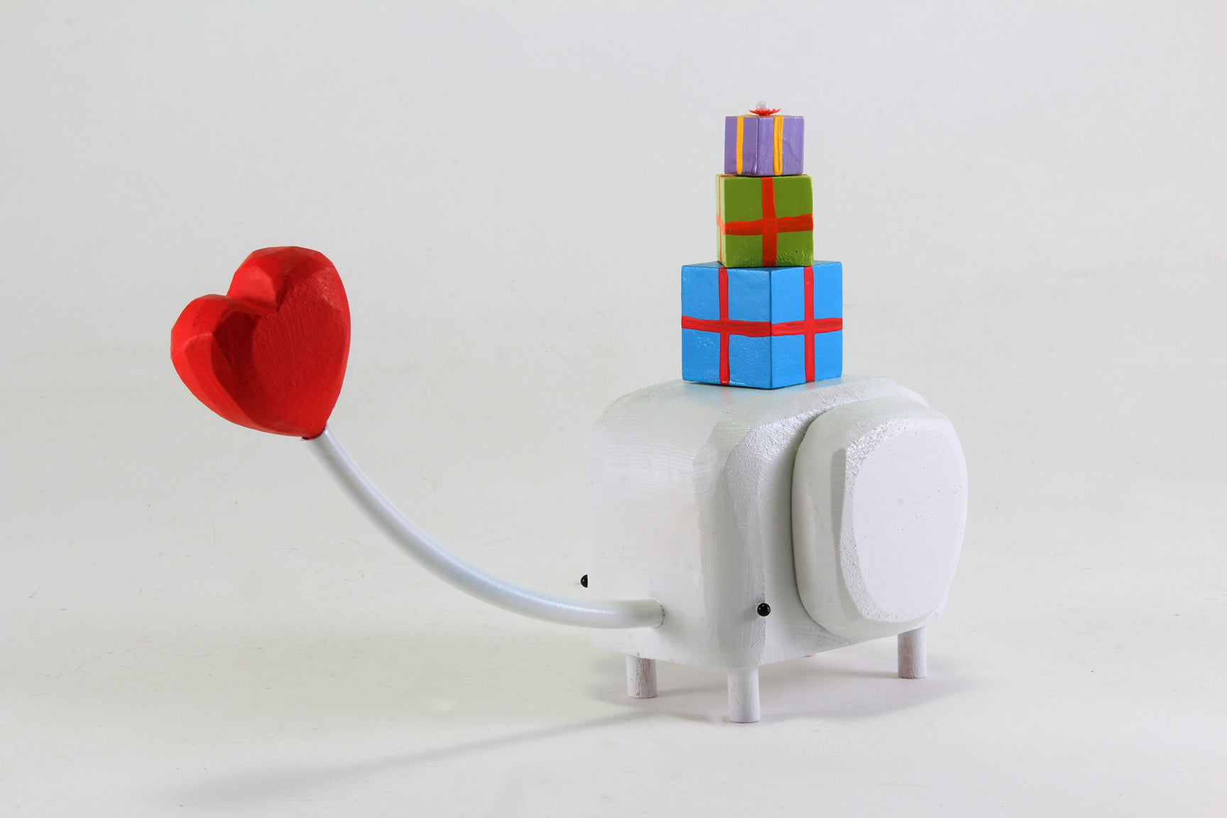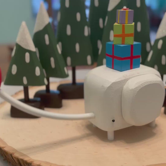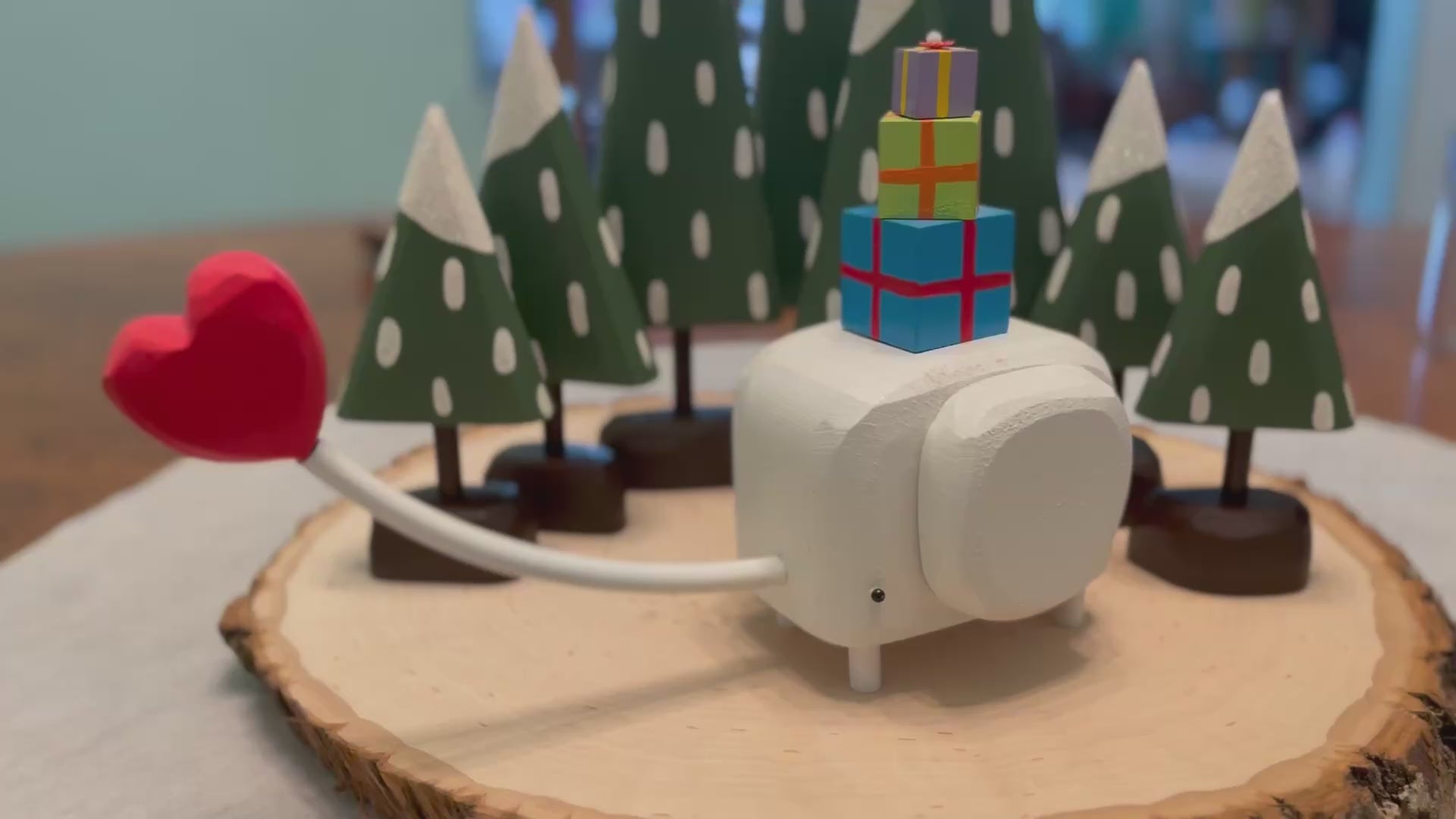 Miniature elephant figure made from wood with a pile of presents and big love for Christmas. Makes a great addition to your collection of Bunny with a Toolbelt figures to create your own tablescape, centerpiece for your holiday entertaining. Or maybe a literal white elephant gift!!!